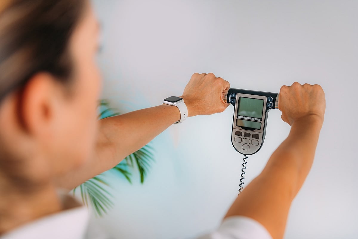 These devices calculate a person’s body fat percentage based on the fact that fat-free body mass like muscle conducts electricity, while body fat doesn’t.